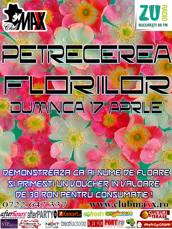 Duminica 17 Aprilie Club Maxx ii premiaza pe toti cei ce poarta nume de flori cu cate un VOUCHER de 30 RON . Petrece Duminica Floriilor alaturi de noi JOIN US !!! info/rezervari : 0722 647 337