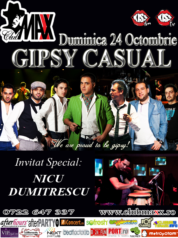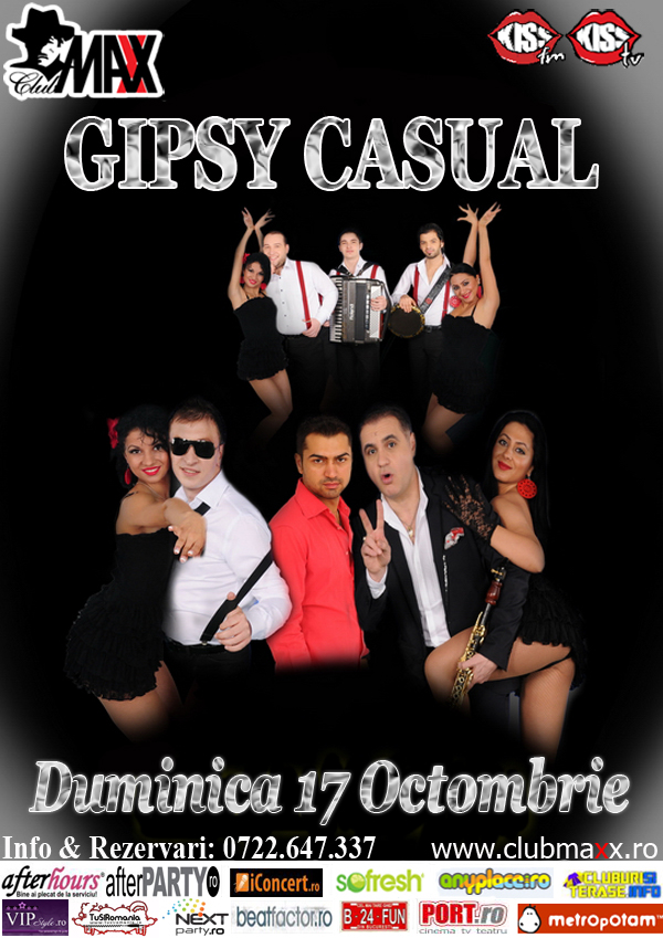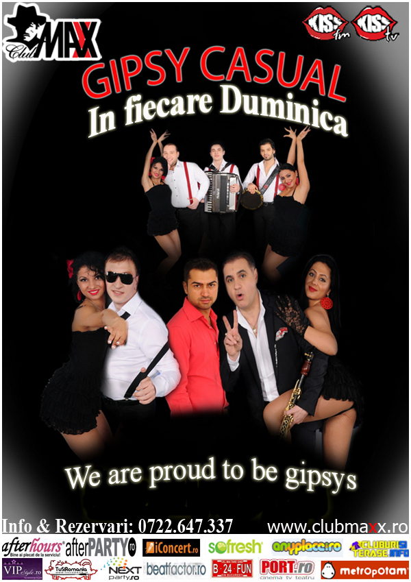 Vino in Club Maxx la cea mai tare petrecere tiganeasca. GIPSY CASUAL propun un concept muzical unic, ce pastreza vie pasiunea tiganilor, imbogatind-o cu sound-uri si ritmuri noi. Improvizatiile trupei readuc in prezent tipare vechi de sute de ani, pe care le alatura muzicii actuale. JOIN US ! Info & Rezervari: 0722.647.337