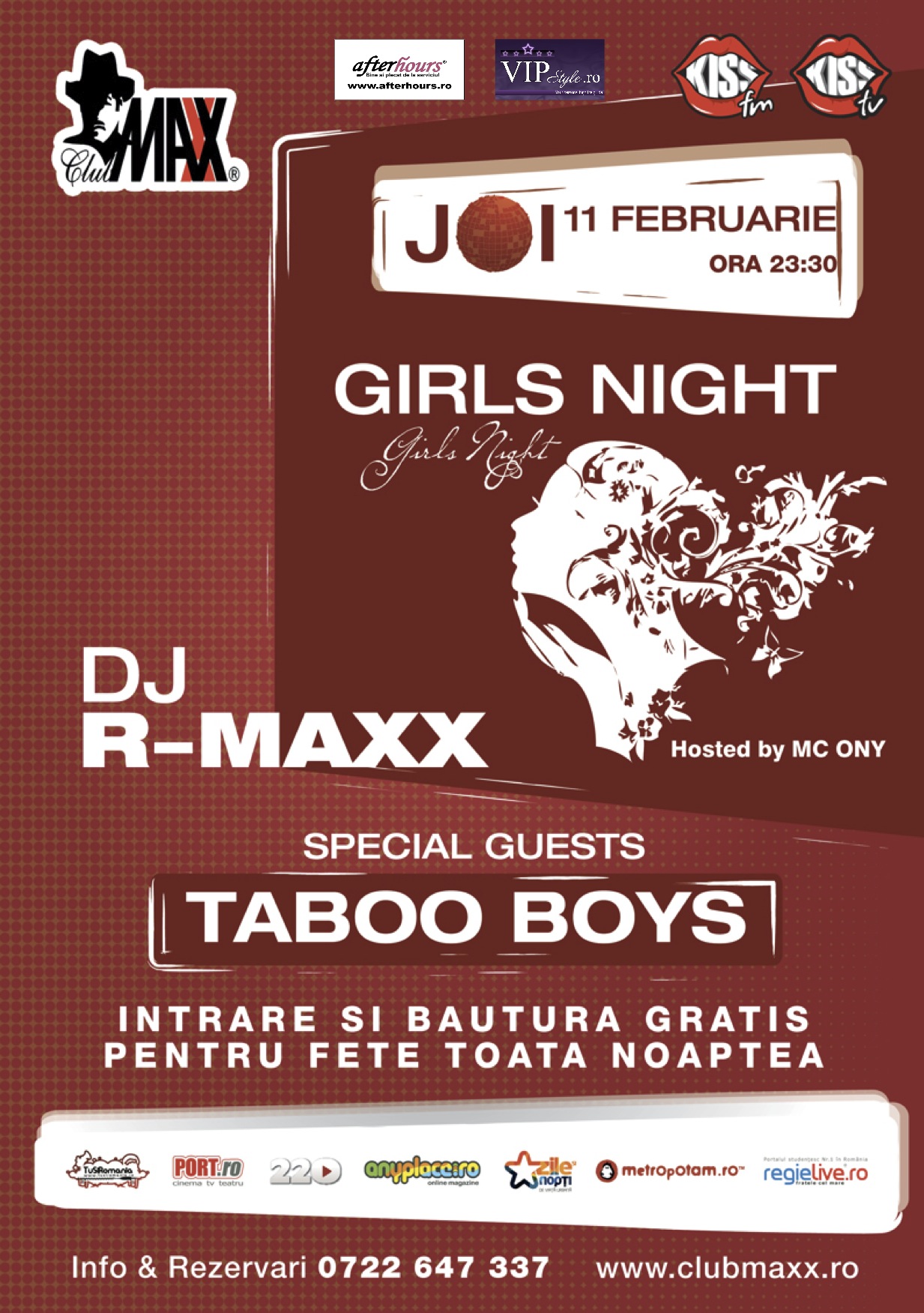 Doamnelor si domnisoarelor, momentul a venit : Joi 11.02 incepanad cu ora 22:00 Club Maxx va invita la o seara dedicata dumneavoastra, o seara in care veti fi niste regine iar noi, umilii supusi vom incerca sa va facem pe plac . Intrarea si consumatia vor fi GRATIS pentru fete iar Taboo boys for incendia atmosfera, pentru o seara perfecta .Va asteptam sa petreceti alaturi de noi, o noapte de neuitat. JOIN US !