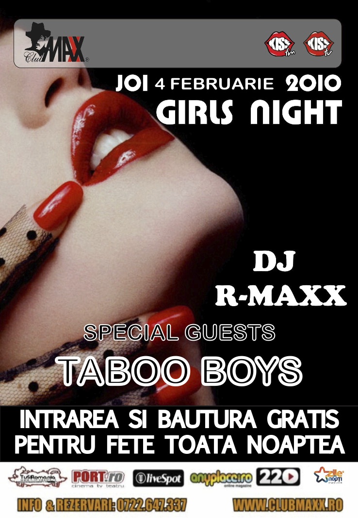 Doamnelor si domnisoarelor, momentul a venit : Joi 04.02 incepanad cu ora 22:00 Club Maxx va invita la o seara dedicata dumneavoastra, o seara in care veti fi niste regine iar noi, umilii supusi vom incerca sa va facem pe plac . Intrarea si consumatia vor fi GRATIS pentru fete iar Taboo boys for incendia atmosfera, pentru o seara perfecta .Va asteptam sa petreceti alaturi de noi, o noapte de neuitat. JOIN US !