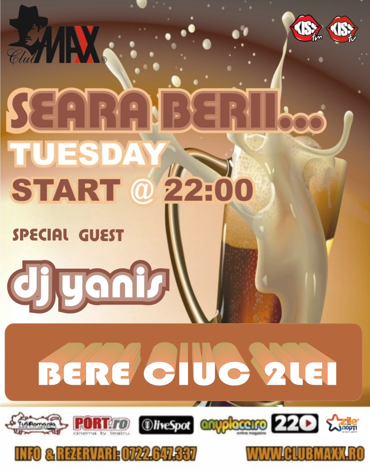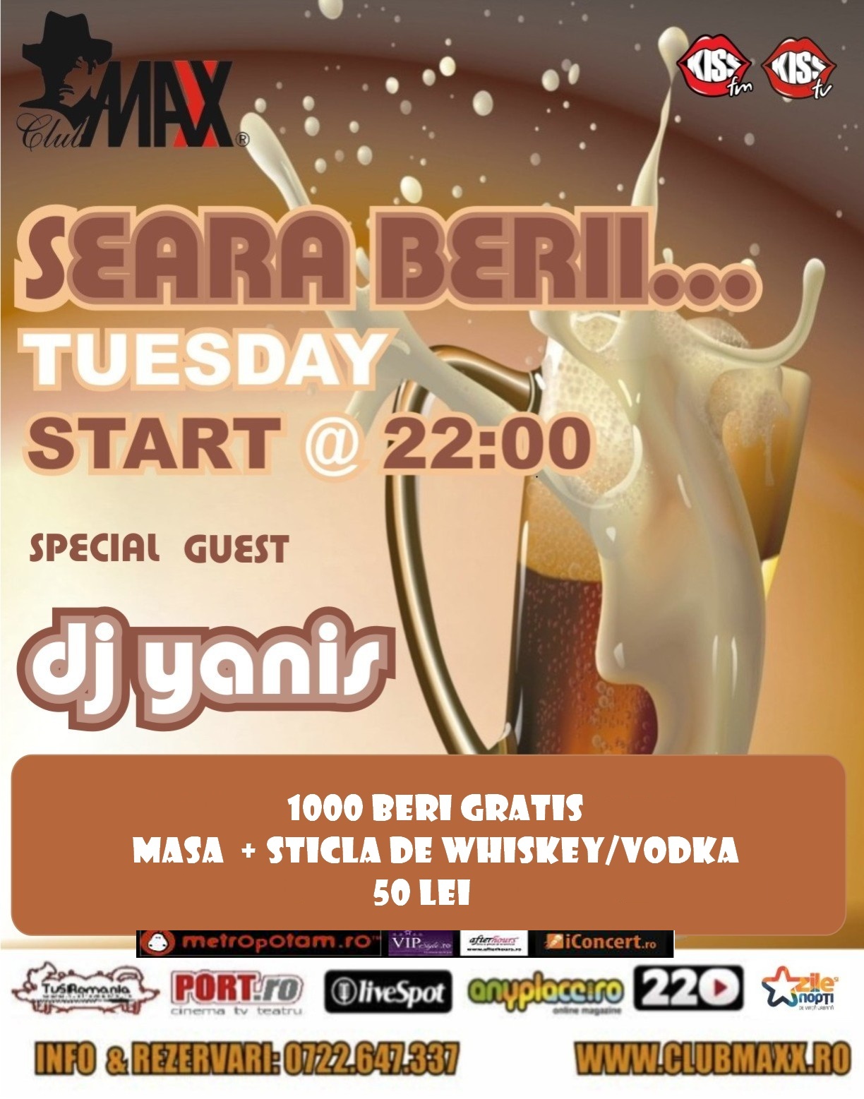 A trecut weekend-ul si deja esti plictisit(a)?...La Maxx petrecerile continua dupa doar o zi de pauza... Marti este SEARA BERII in care studentii si studentele umplu ringul de dans.... 1000 beri gratis... promotii si preturi ca pentru inceput de saptamana : masa cu sticla de whisky sau vodka costa DOAR 50 LEI , barmanii fac cinste fetelor care dau dovada de nonconformism si danseaza pe bar .....iar cea mai curajoasa fata este premiata... In fiecare Marti...o petrecere fara inhibitii care creaza dependenta. Marti 23.02 incepana cu ora 22:00