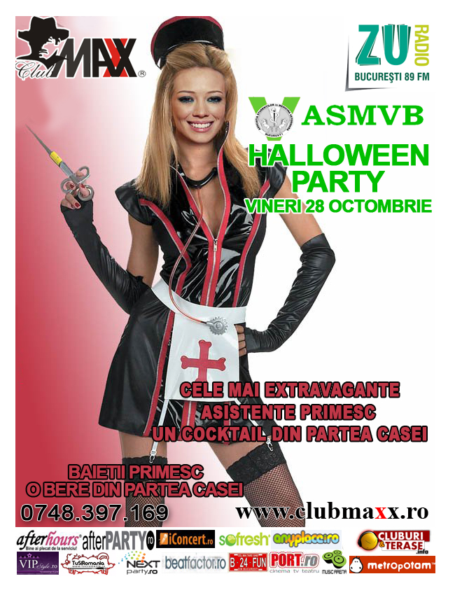 Asociația Studenților în Medicină Veterinară București va invita Vineri 28 Octombrie in CLub Maxx la "Halloween Party". Cele mai extravagante costume primesc un Cocktail din partea casei! Join Us! 0722.647.337