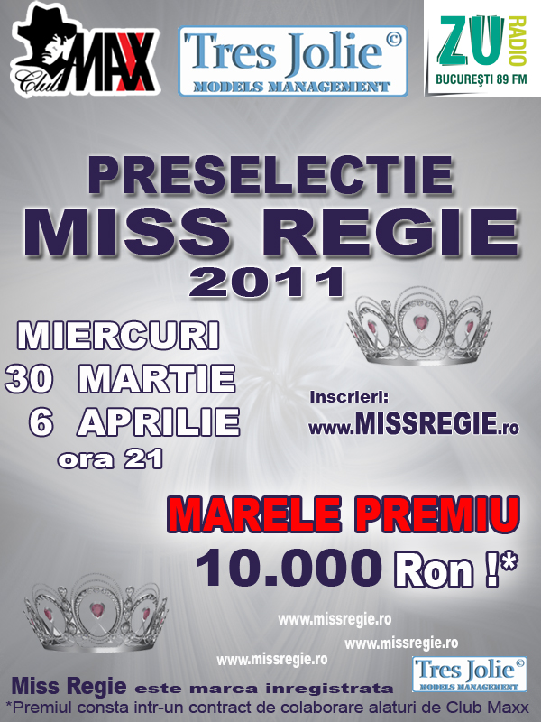 Miercuri 30 Martie si 6 Aprilie incapand cu ora 21:00 asteptam toate studentele la PRESELECTIE MISS REGIE 2011! Concursul va avea loc in data de 8 Aprilie! MARELE PREMIU 10.000 Ron!!! Inscrieri pe www.missregie.ro! Info:0722.647.337!