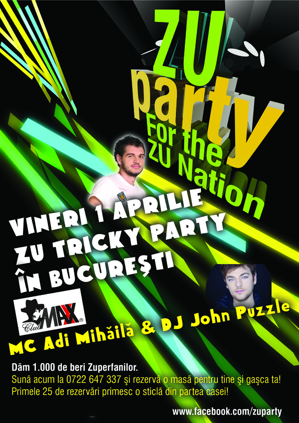 Vineri 1 Aprilie "ZU Tricky Party" @ Club Maxx! Invitati MC Adi Mihaila & Dj John Puzzle! O sticla de whisky/vodka din partea casei la fiecare grup de 6 persoane!!! Join Us! Info&Rezervari:0722.647.337