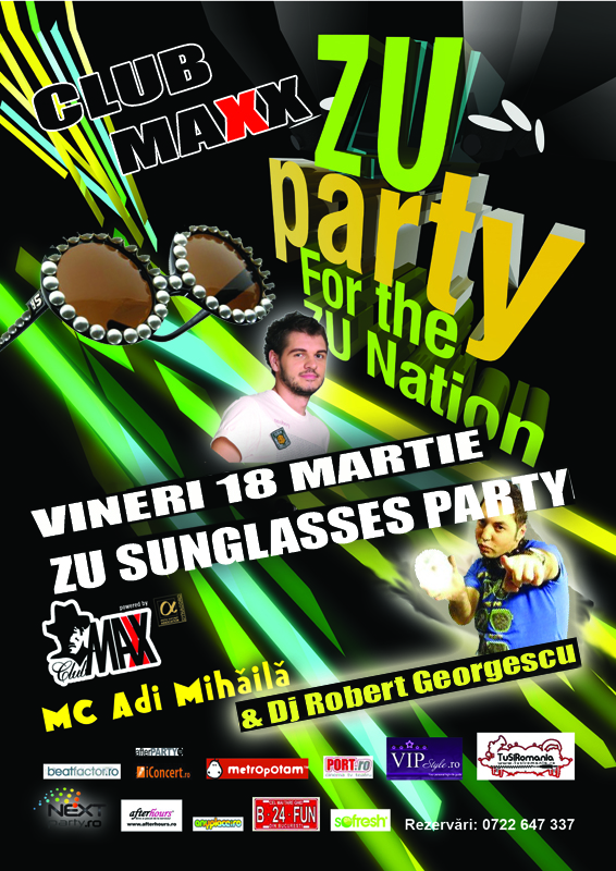 Vineri 18 Martie "ZU Sunglasses Party for the ZU Nation" @ Club Maxx! Invitati special MC Adi Mihaila & Dj Robert Georgescu!!! Join Us! Info&Rezervari:0722.647.337