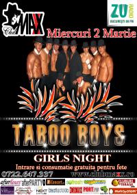 La cererea tuturor fetelor care nu au ajuns la Show-ul de 1 Martie TABOO BOYS vor repeta show-ul Miercuri 2 Martie in Club Maxx. Fetelor va asteptam la un spectacol incendiar !!! Intrarea si bautura gratis pentru Fete ::: info/rezervari 0722 647 337
