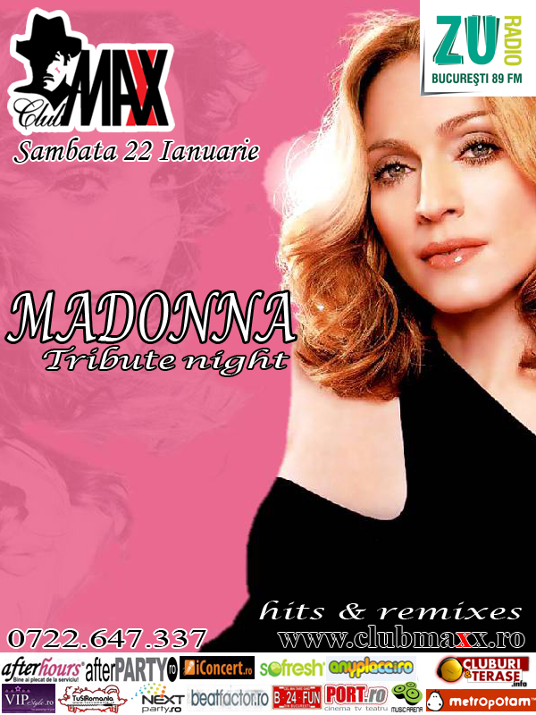 Sambata 22 Ianuarie "Madonna Tribute Night" - vino in Club Maxx pentru a celebra o intreaga istorie muzicala plina de hituri precum "Like A Virgin";"Vogue";"Like a Prayer";"Celebration" sau cel mai nou hit al sau "Revolver"! Join Us! Info&Rezervari:0722.647.337