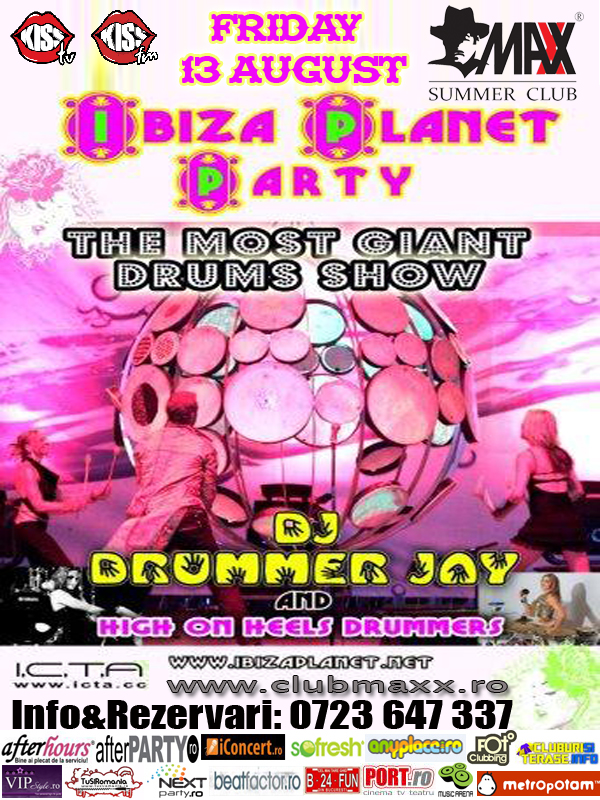 Vineri 13 august MAXX SUMMER CLUB te invita la un show captivant de sunet si culoare: IBIZA PLANET PARTY. THE MOST GIANT DRUMS SHOW - DJ DRUMMER JAY and HIGH ON HEELS DRUMMERS. JOIN US !! Info&Rezervari: 0723 647 337.