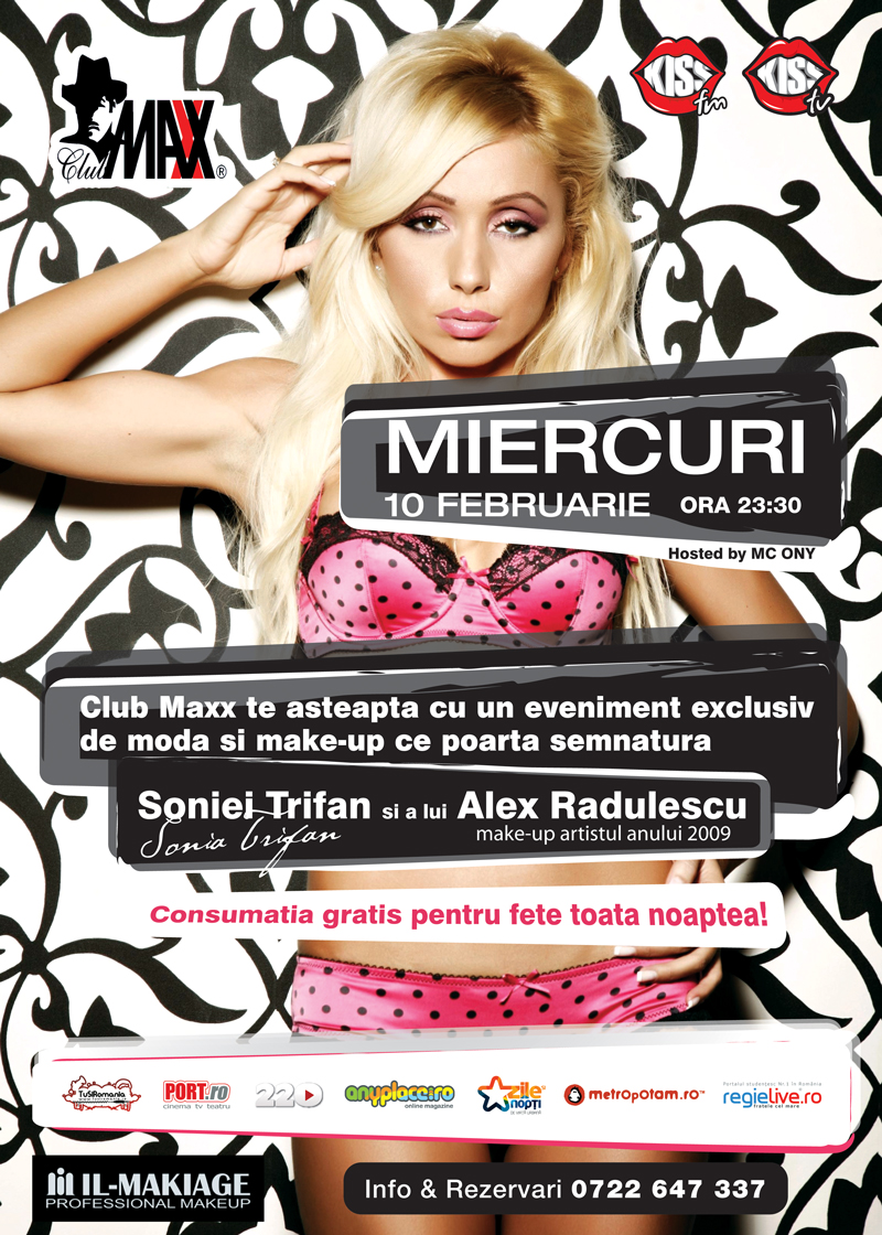 Miercuri 10 februarie de la ora 23.30 Club Maxx te asteapta cu un eveniment exclusive de moda si make-up ce poarta semnatura Soniei Trifan si a lui Alex Radulescu, make-up artistul anului 2009. Cele mai noi rochii ale Soniei Trifan vor fi puse in evident de machiajul professional realizat de Alex Radulescu si echipa sa de la Il Makiage.