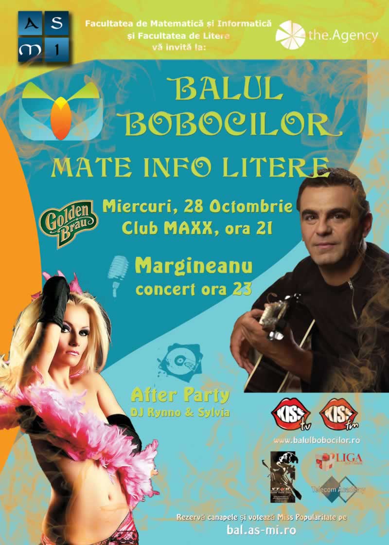 Asociatia Studentilor la Matematica si Informatica impreuna cu The Agency va invita la Balul Bobocilor al Facultatii de Matematica si Informatica si a Facultatii de Litere, un eveniment de traditie al celor doua facultati.